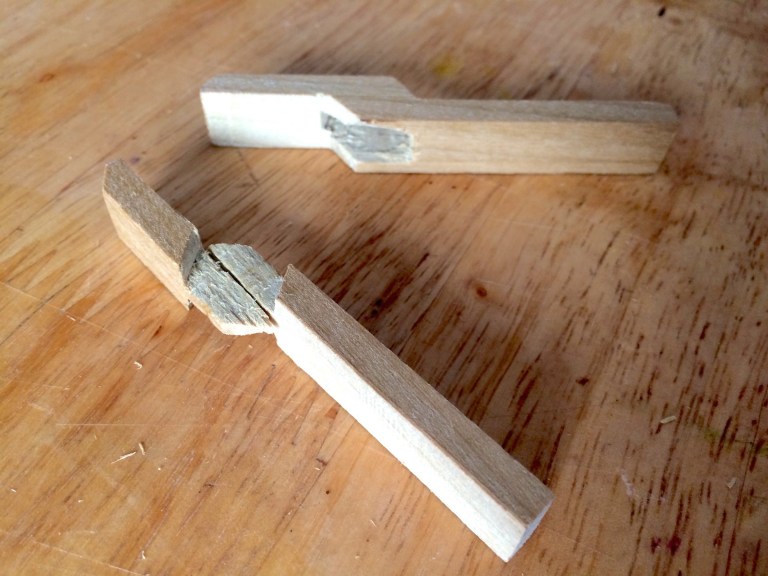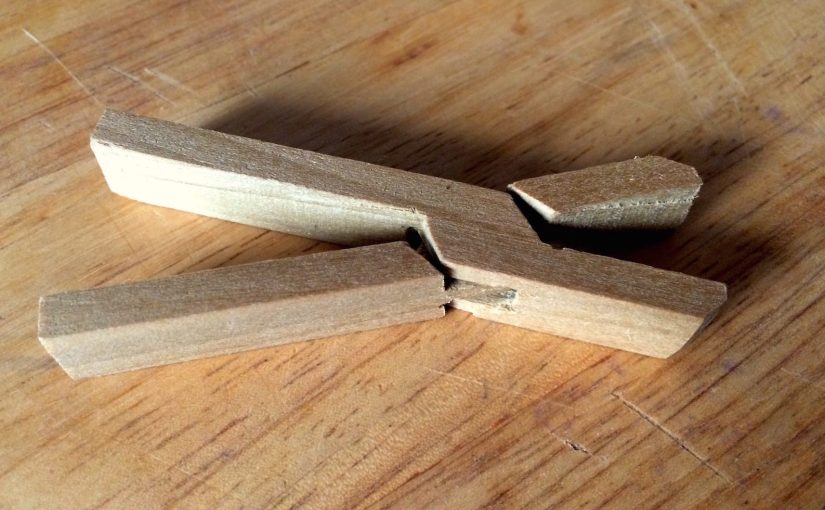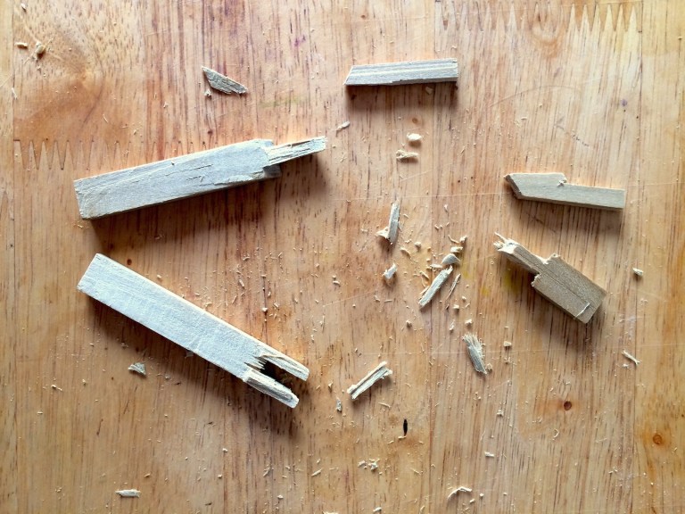 SourceWhen I first saw this video, I was stunned — I had to make my own right away. Now unlike David, I didn’t have any nice, straight-grained, basswood lying around, so I had to settle for a piece of square poplar dowel. Apparently my wood was quite a bit harder than David’s. And what’s worse, my dowel wasn’t sawn parallel with the grain, but rather at 45-degrees, which means it wouldn’t split naturally in the proper ways. So I think I made things harder on myself by not starting with the right material.