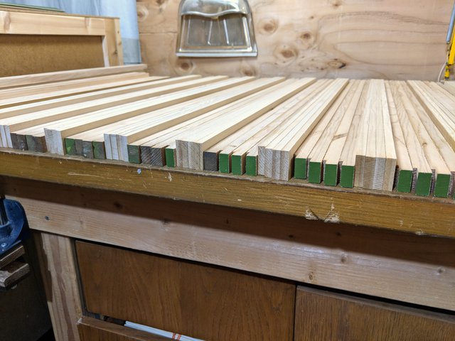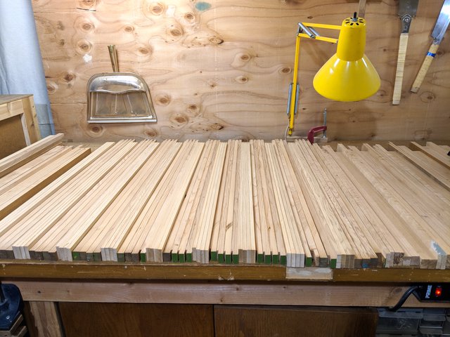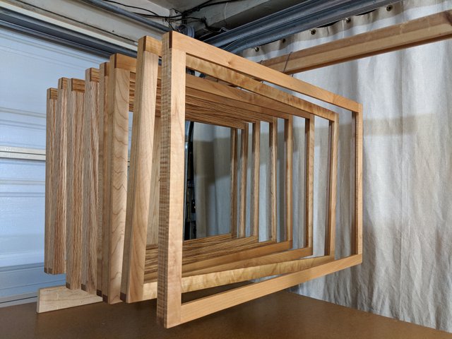 There are 4 different length components that make up a frame. It takes a pair of each which is 8 pieces to make a whole frame. Here are the pieces all cross cut to length using the table saw sled. Each piece is about 1/4" over length, for convenience during the glue-up process coming up. The excess will be trimmed off on the final table saw operation.