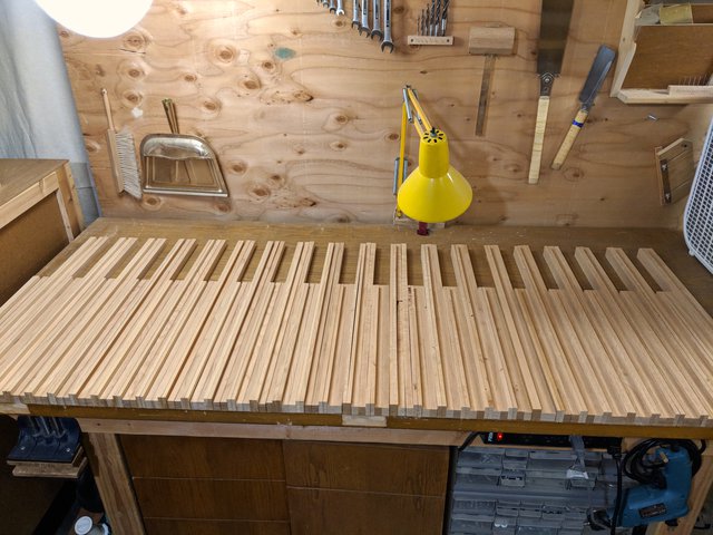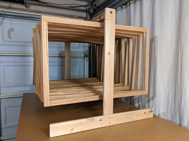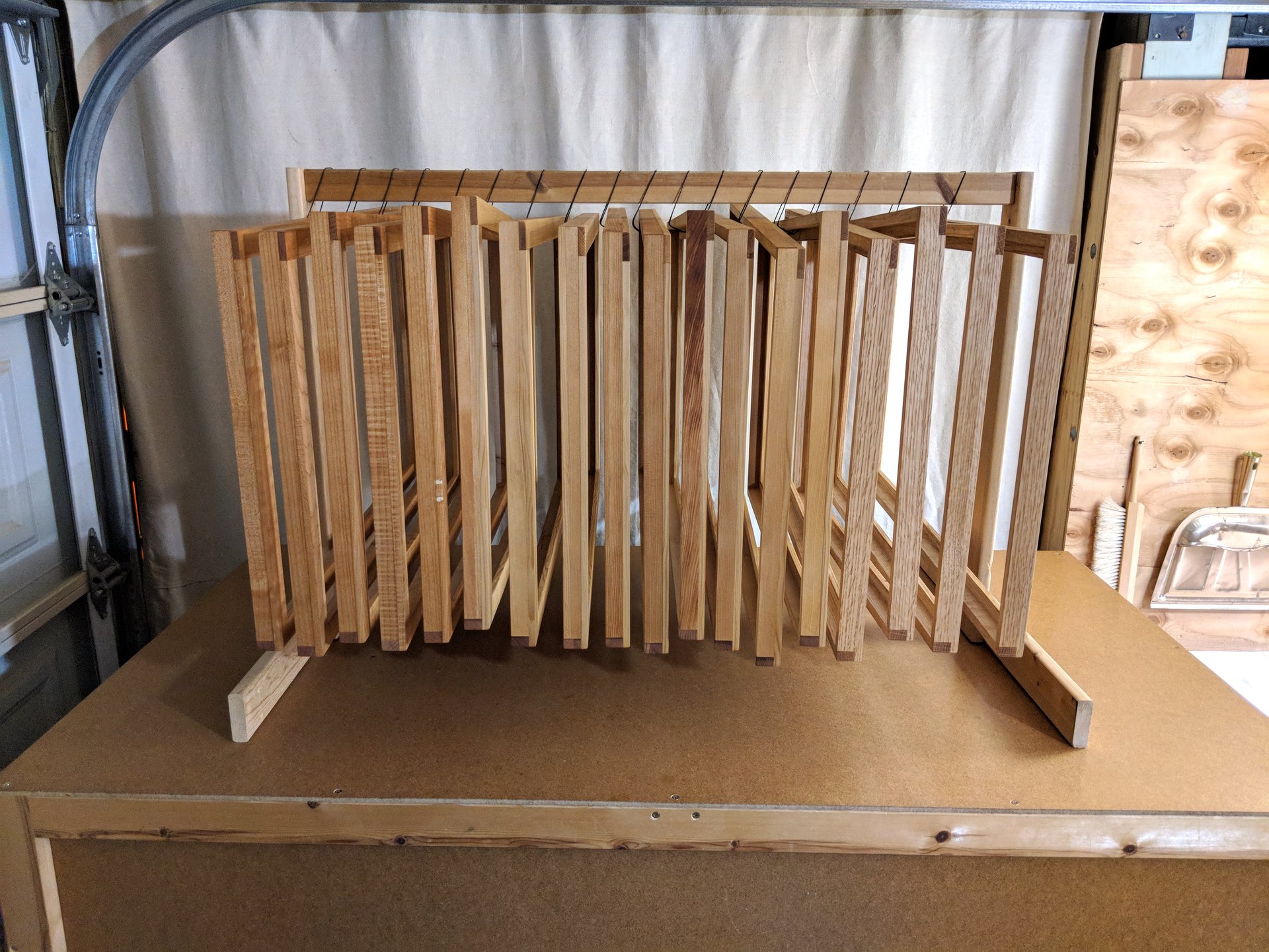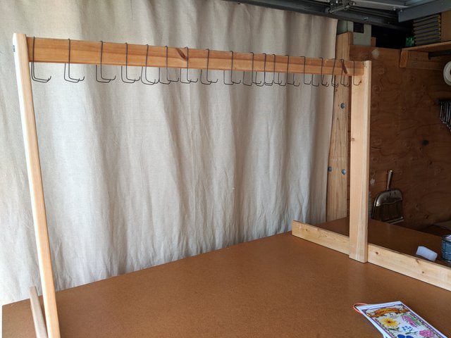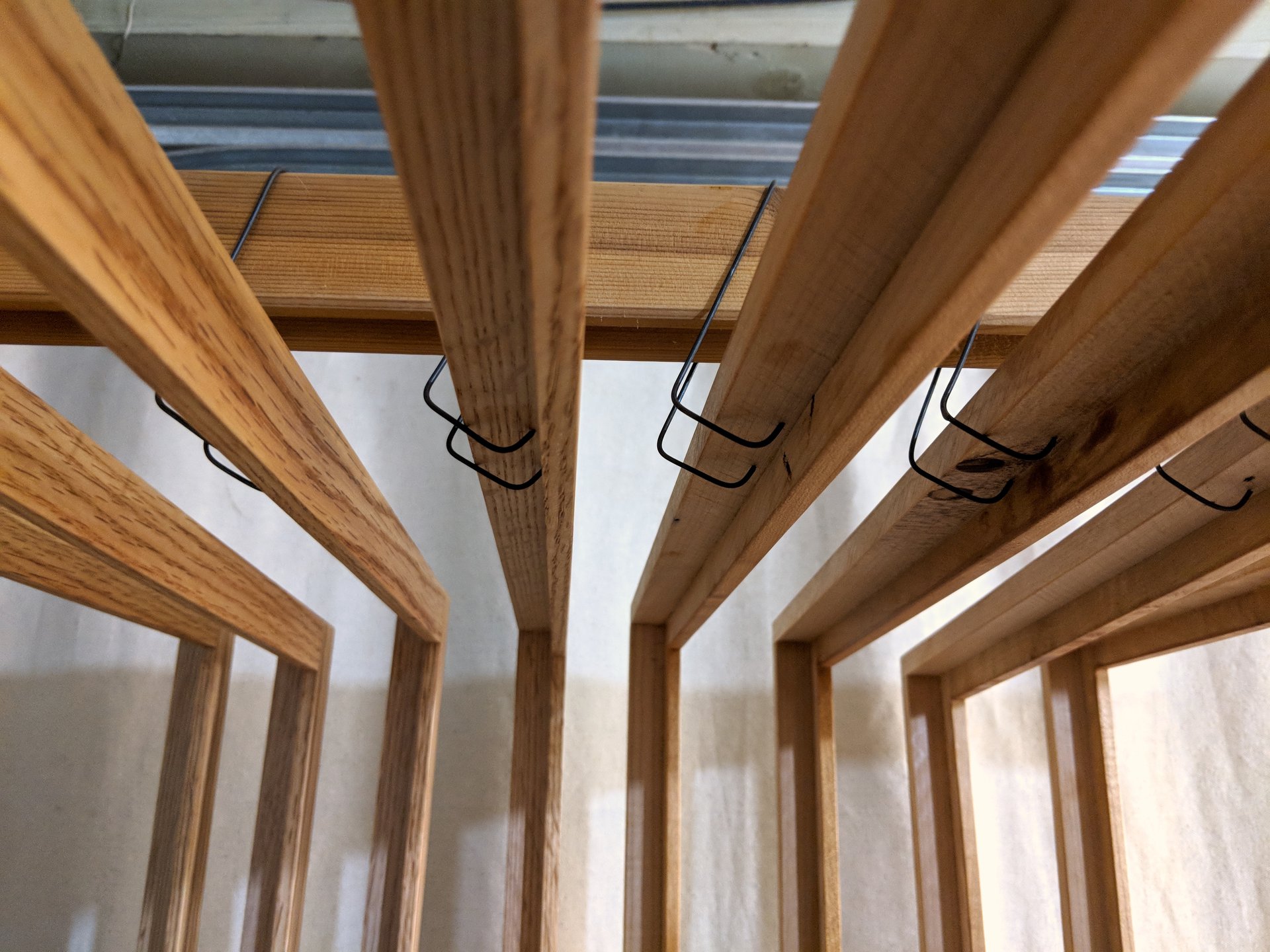 In preparation for varnishing, I prepare a scaffold with hooks so that the frames can all be hung up to dry, exposed to the air all around, after varnish is applied.