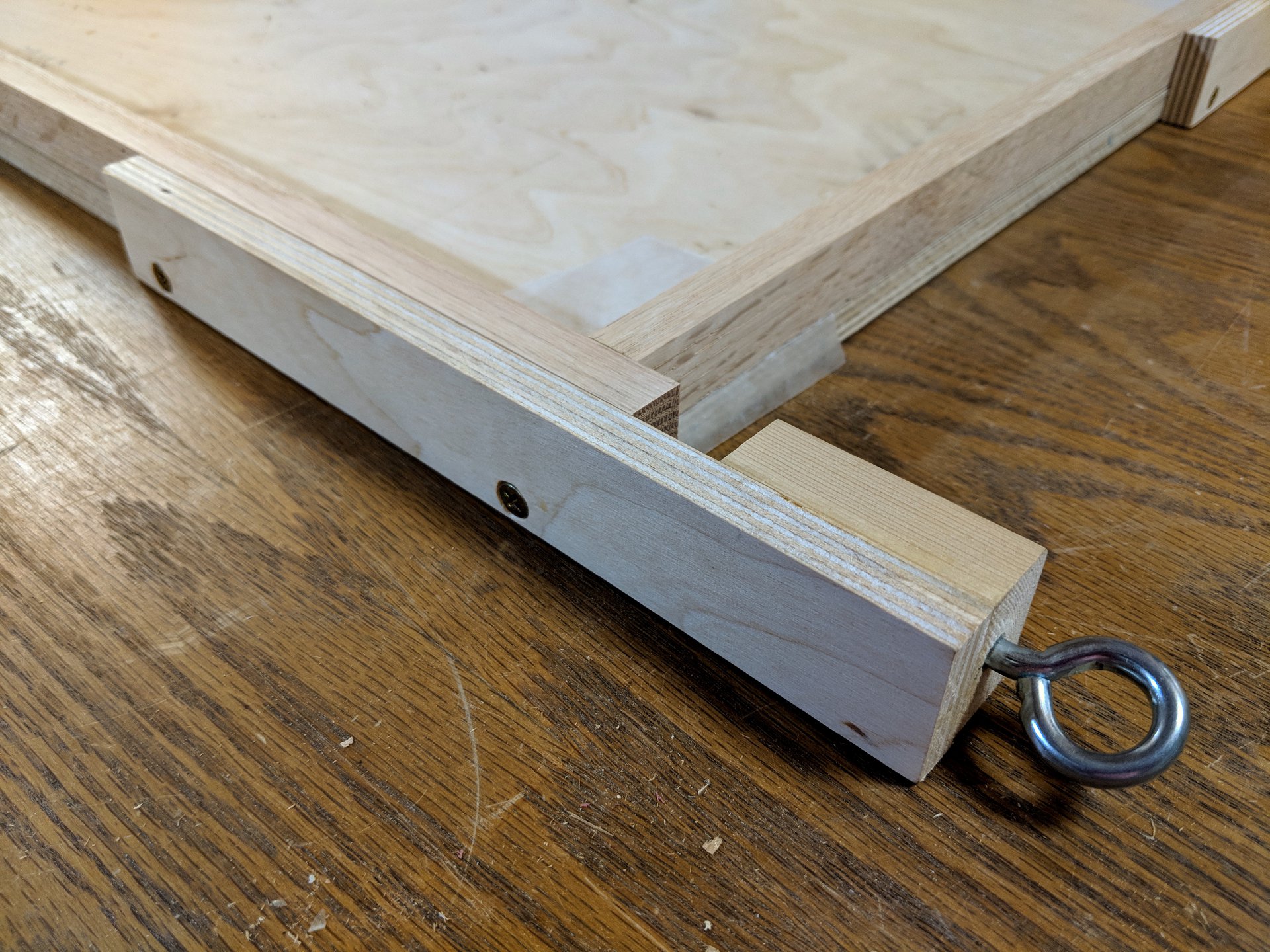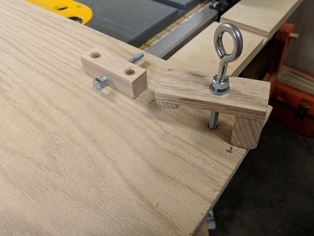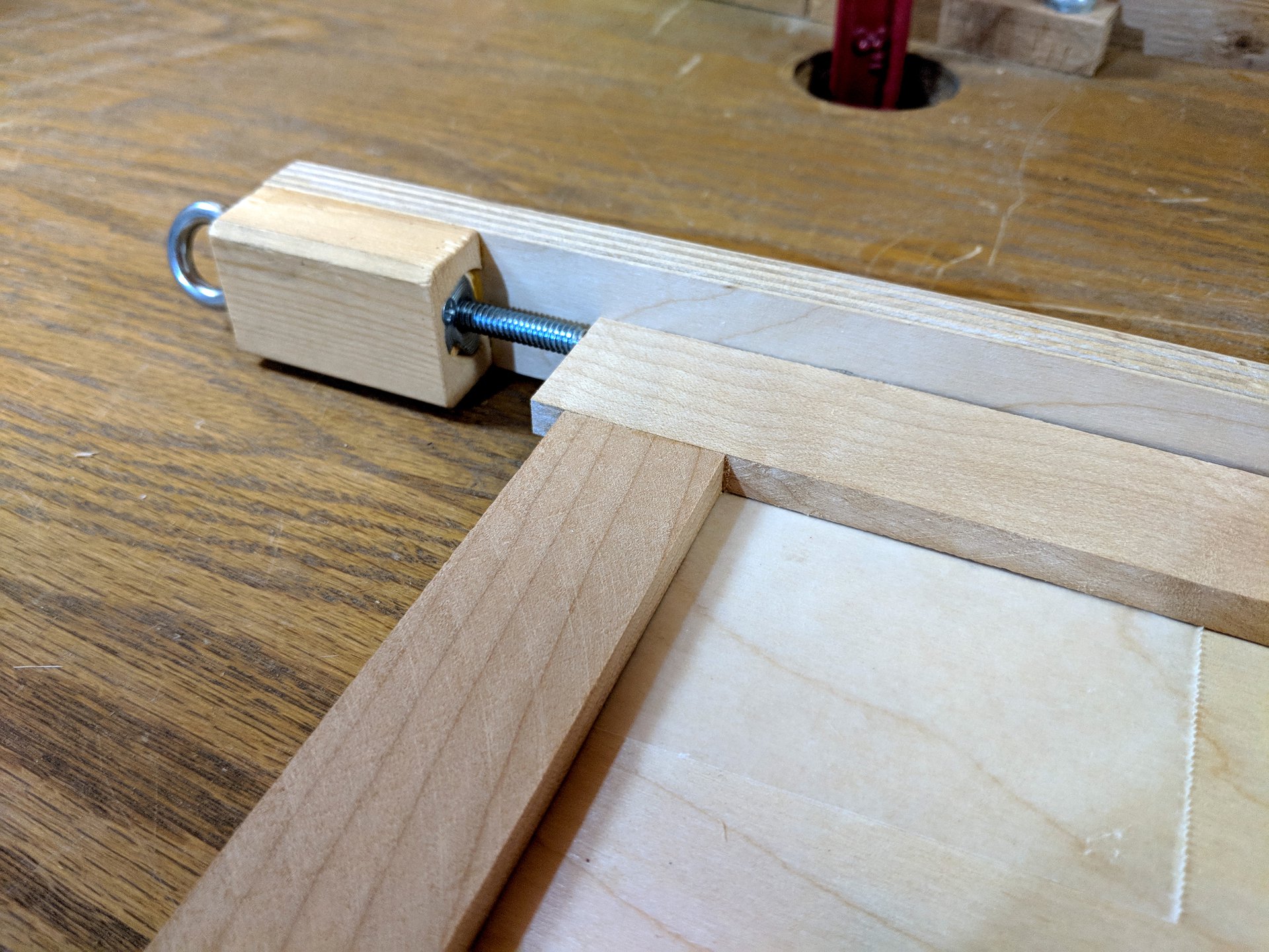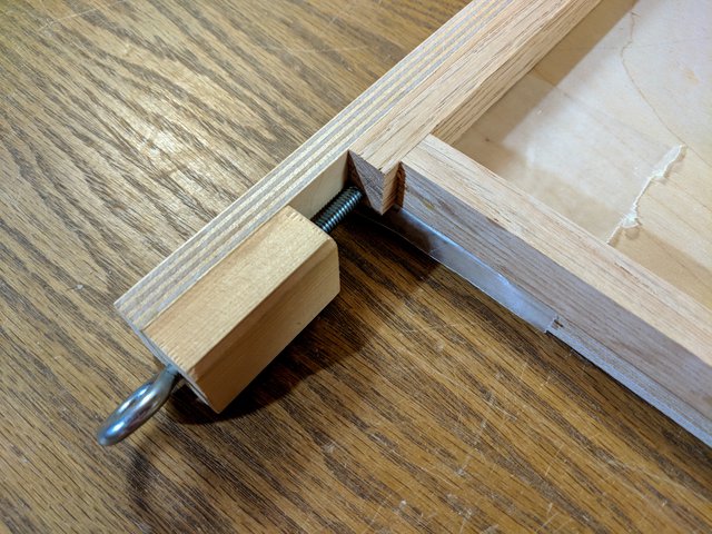 These clamps use another eye screw interfacing with a t-nut. This time however, the screw pulls instead of pushes. It pulls down on a clamping caul to leverage down on the frame without marring it. If you notice there's a small nail just next to the tall side of the caul, this is to keep it oriented properly when tightening down on the eye bolt.
