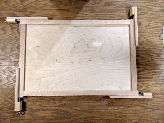 Here is how the setup looks when the sled is holding a frame oriented along the short edge. The middle clamp goes into action, but otherwise the same principles apply.