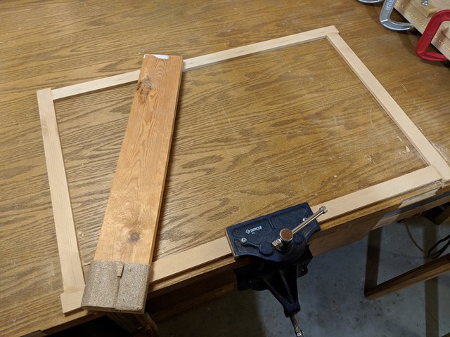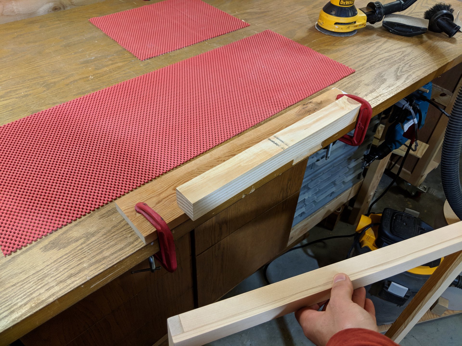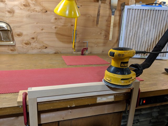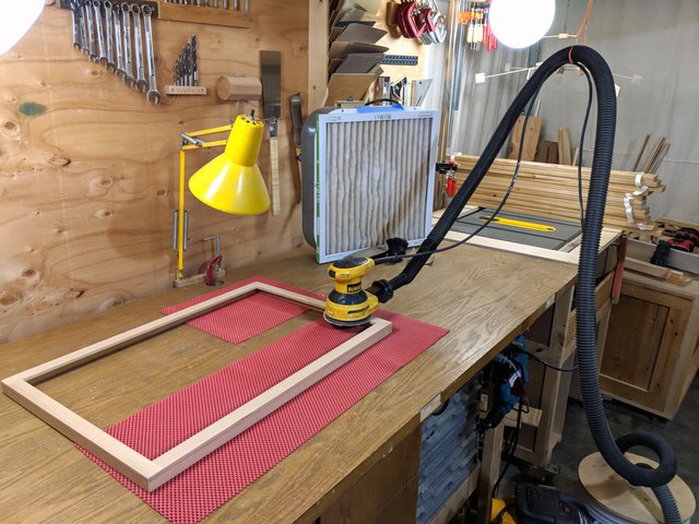 I mount a rail on the edge of the workbench so I can support the frame vertically for sanding the outside edges.