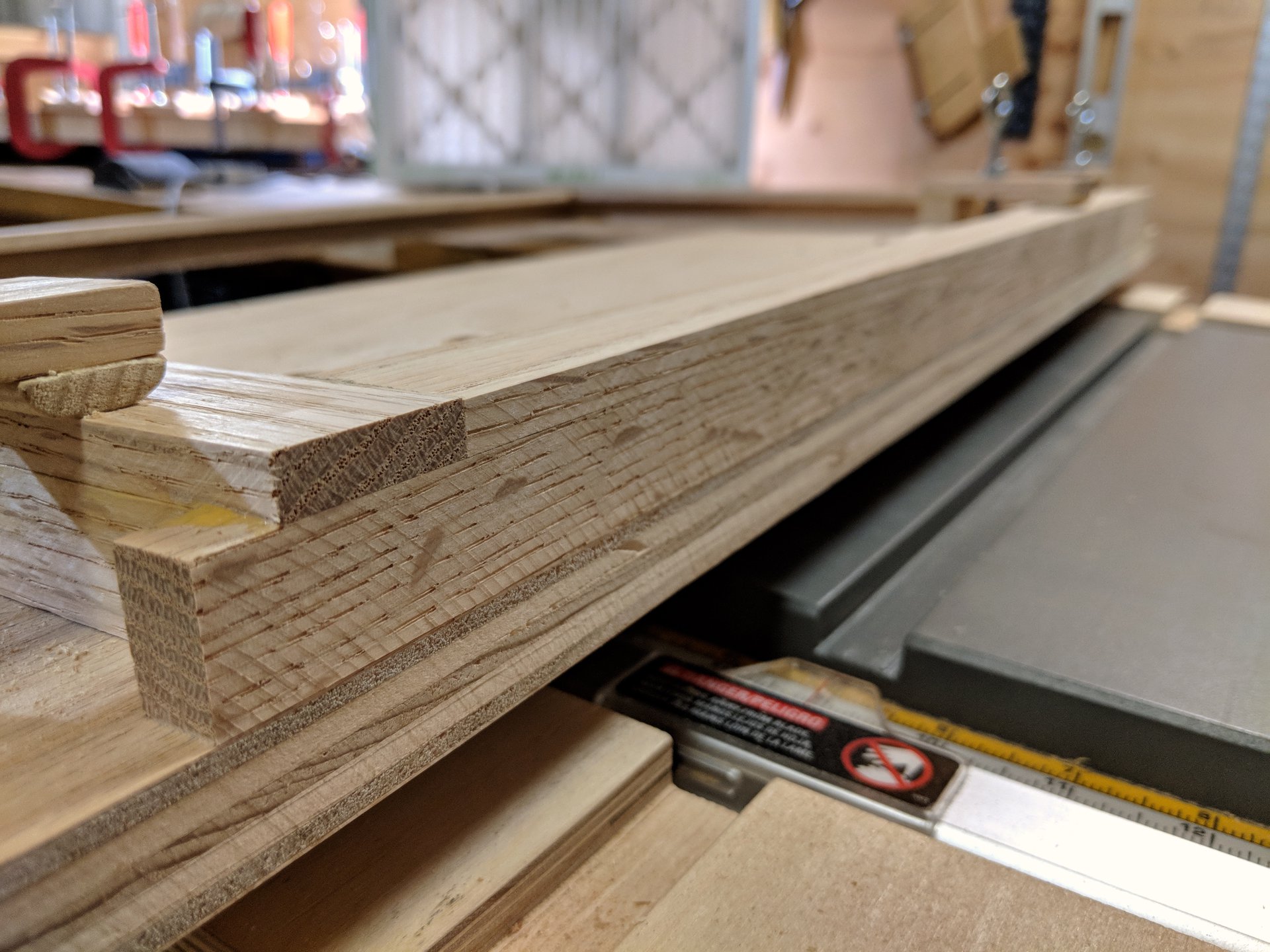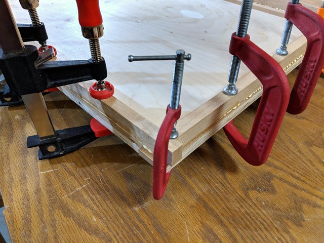 These custom made clamps are positioned to be in the right spot to hold either a face piece or a wall piece. The clamp does leave marks on the end of the pieces they are clamping, but this is inconsequential as these ends will be trimmed off in an upcoming step.