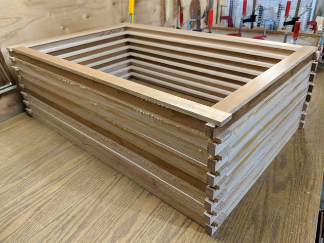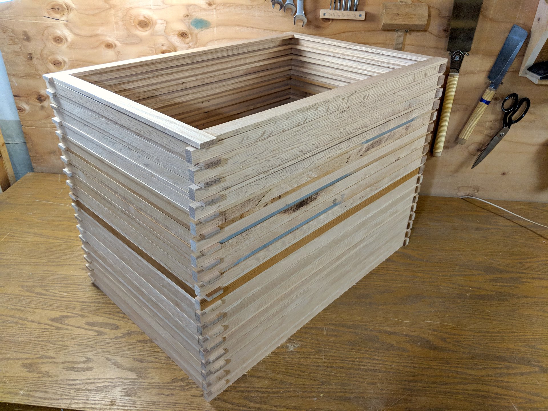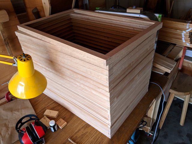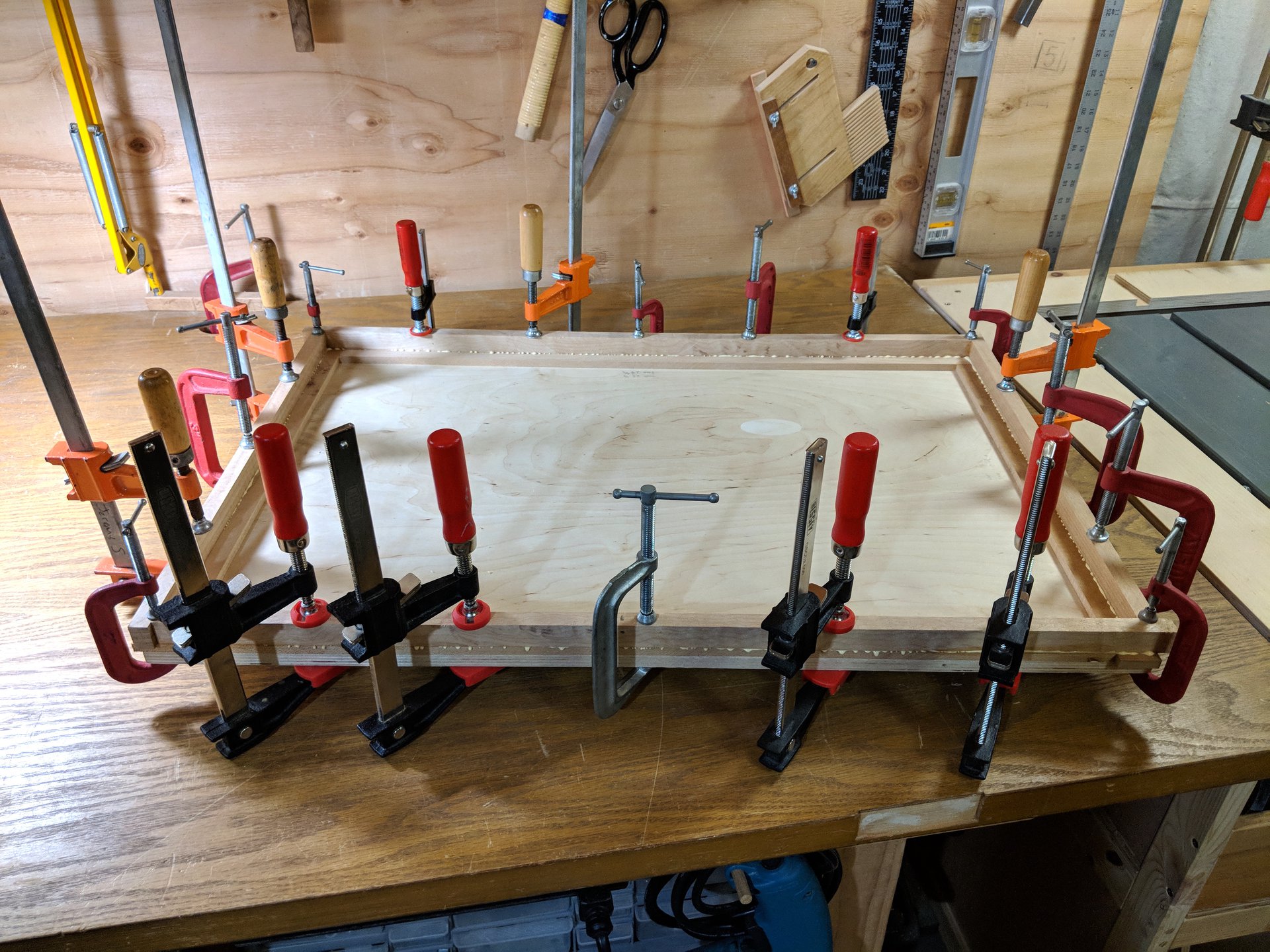 The 4-way clamping jig performs beautifully, I can set an assembly up in a few minutes, and then come back when the glue is dry and do another. About halfway done at this point.
