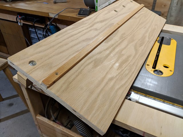To make the rail which guides the sled through the table saw's slot, I used a not-particularly-straight scrap of pine board. But this is not a problem, as I can ensure straightness by mating it to the sled into a dado that I cut on the underside. Thus when it goes together, the rail is brought into straightness.
