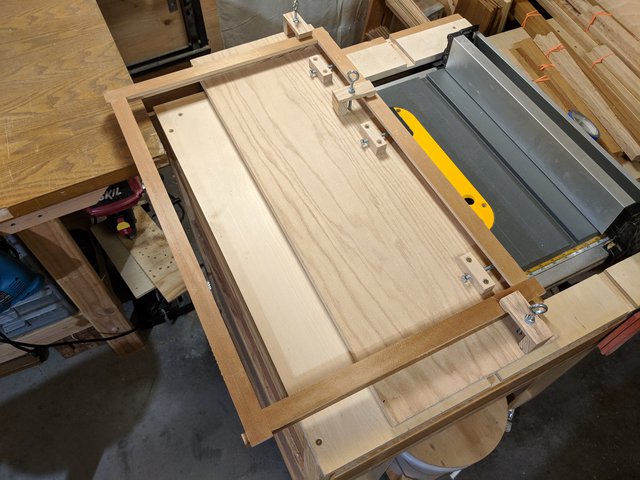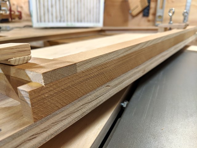 This table saw sled makes all the difference in the final outcome of the frame quality. It enables smooth and accurate trimming of the walls of the frame on all 4 sides. This removes the raw face of the wood pieces, the glue exterior glue squeeze-out, and the deliberately over-length protrusions from the ends of the boards.