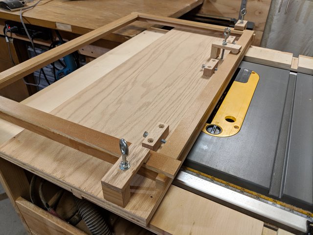 I built custom hold-down clamps into the sled to securely hold the frame in place for the trim. They're positioned so as to be able to hold a frame down along a long edge, or along a short edge.