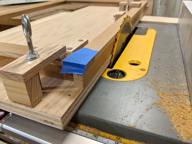 As it happens, the overlapping direction that I chose for this first set of frames has a slight downside when paired with this left-side table saw sled. That is, the blad exits across the grain on the face piece, which may lead to tear-out. For this batch I was able to remedy this issue using blue tape to bind the end grain together during the cut. For the next batch of frames, I'll reverse their "handedness" so that they cut flawlessly on this sled, no tape needed.