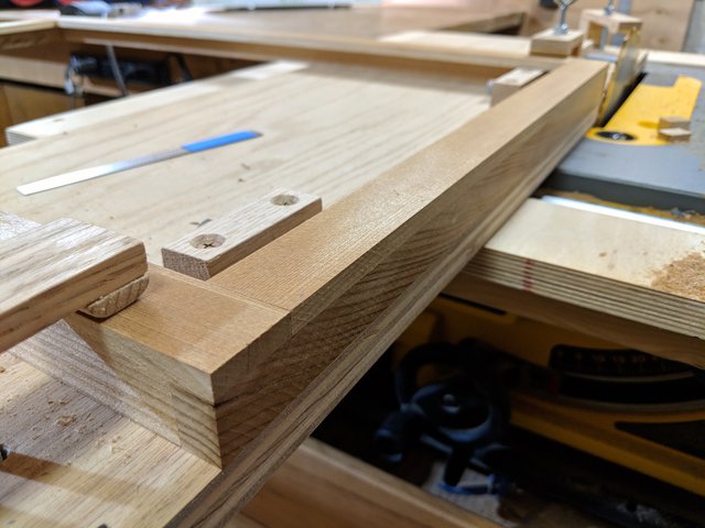 The mating step is more time consuming than the butt joints for each of the assemblies. This is because more attention is required to ensure alignment, more clamps are needed, and the glue squeeze out removal in the rabbet requires methodical care. Still, production moves along steadily.