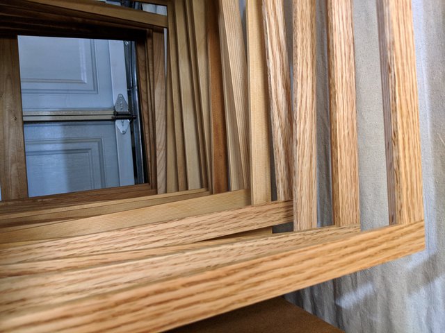 These frames are sturdy, square and true, ready to protect and display artworks in a capsule of preservation. I enjoy seeing the integration of the marks and imperfections you get from working with reclaimed wood. Here I find they add beauty without intruding, and even become integral to the piece.