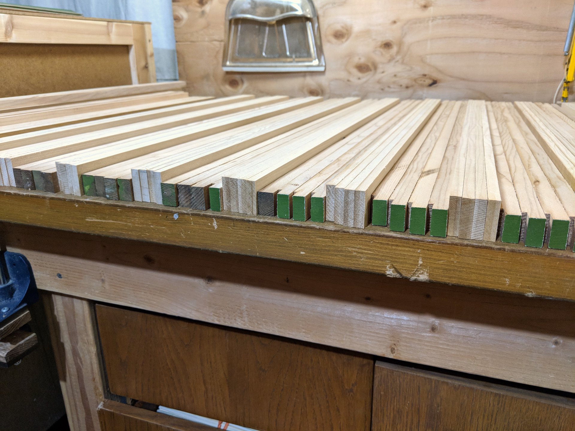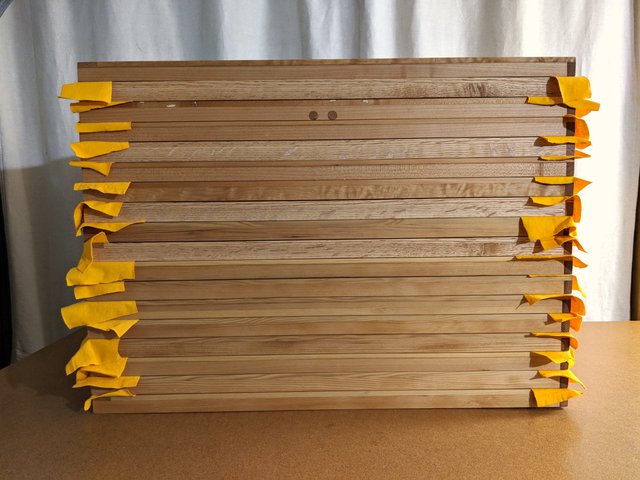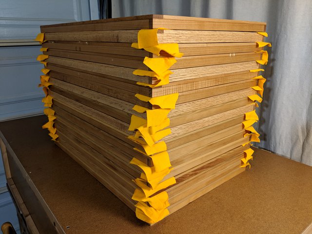 Here is a stack of alternating face assemblies and wall assemblies. Next I'll prepare to unite one of each to make complete frames.