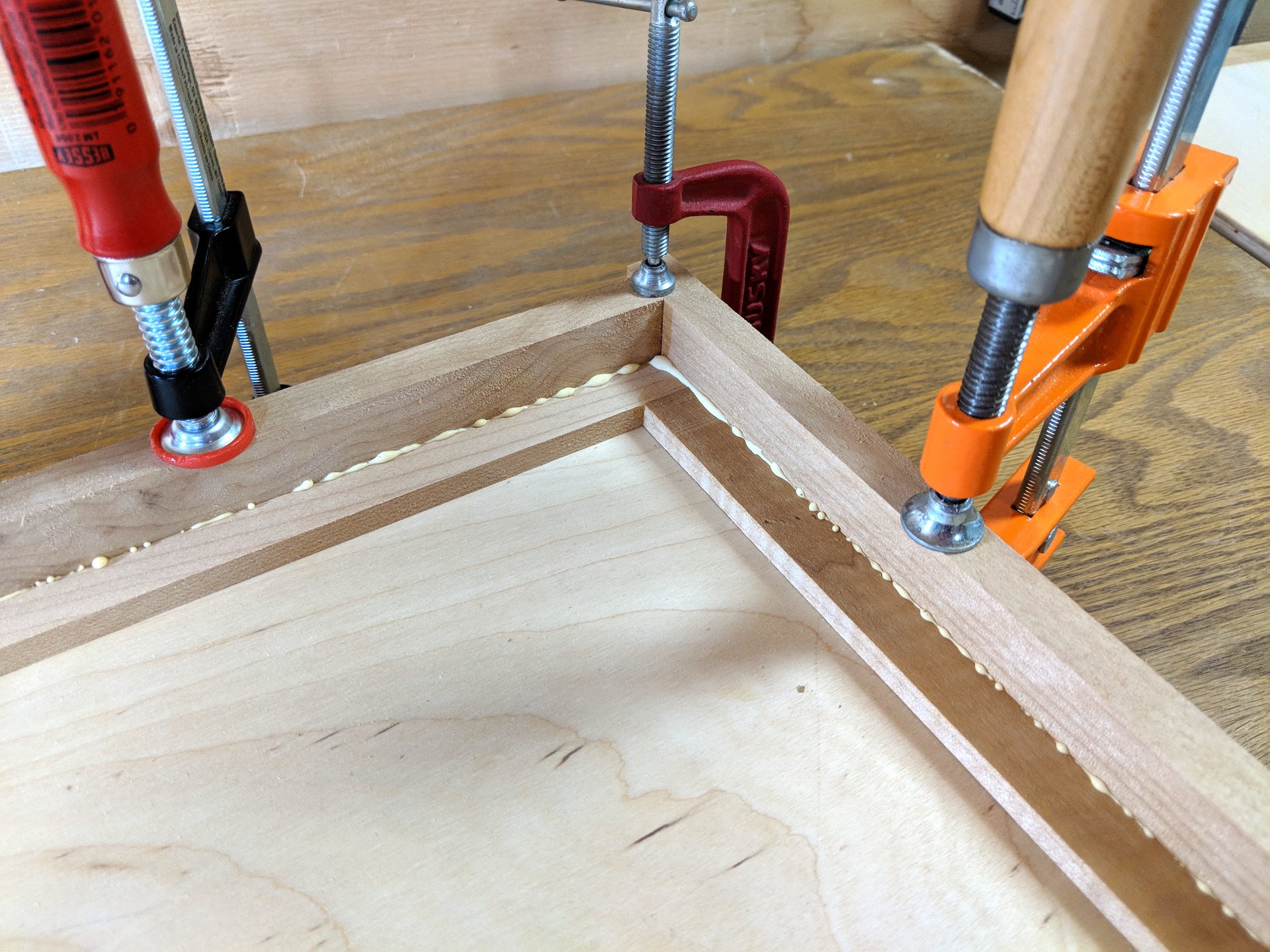 For this phase, I remove the screw clamps from the jig and utilize its rectangular platform to keep everything square and flat for this glue up process. I use plenty of glue, expecting lots of squeeze-out, to ensure a perfectly solid joint.