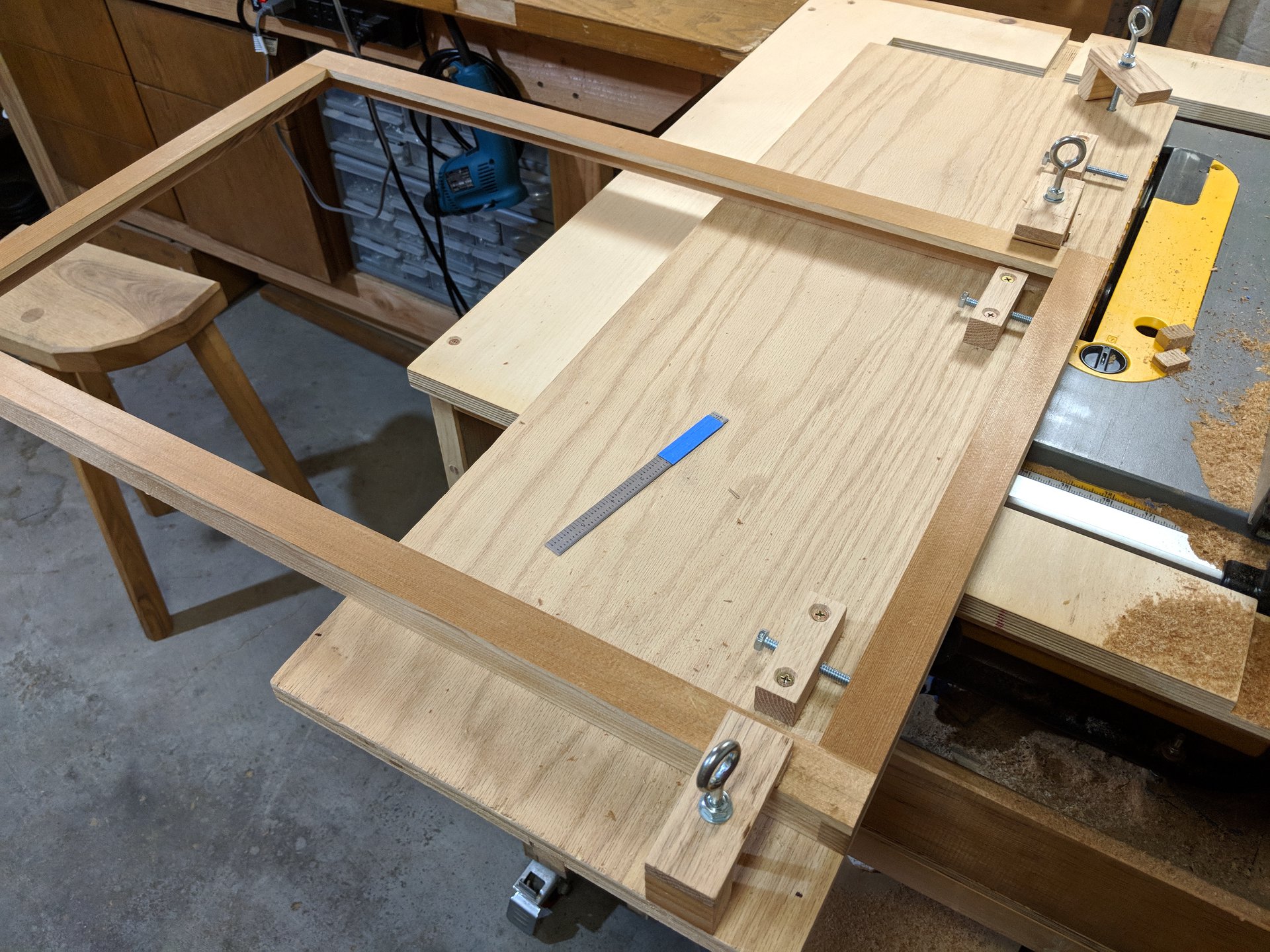 The rigidity and flatness of the baltic birch base ensures adequate flatness. To ensure squareness when mating two assemblies together, I clamp the corners first, adjusting and pushing or pulling the assemblies in place to align with the plywood base.