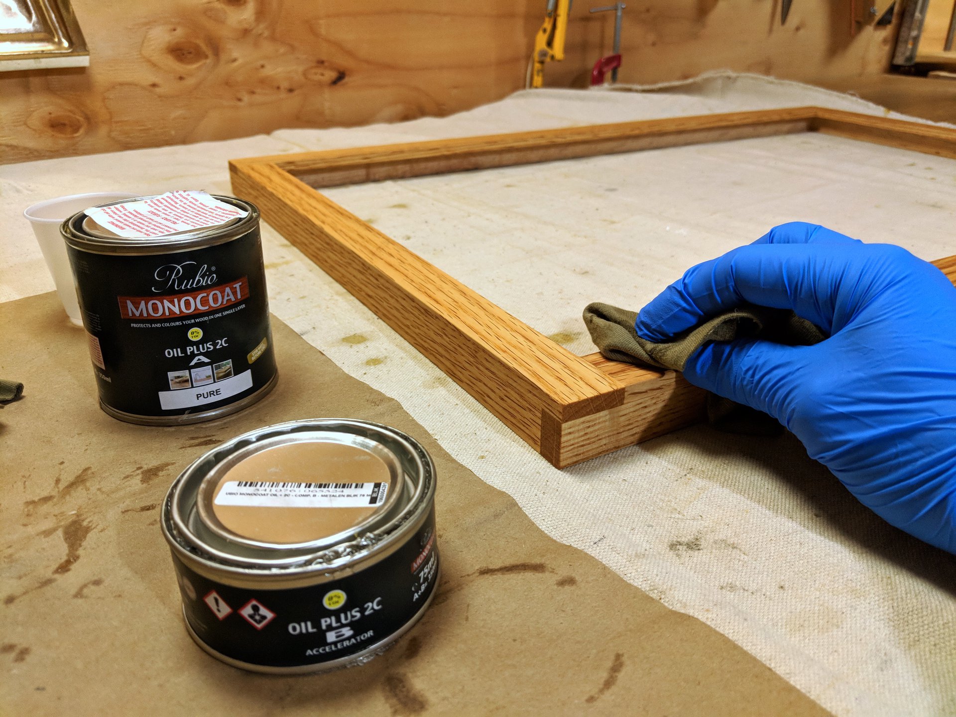 The varnish is applied only to the exterior surfaces of each of the frame. The rabbet and the the backside are left as raw wood to better adhere to the frame sealing tape that will protect the frame package within.