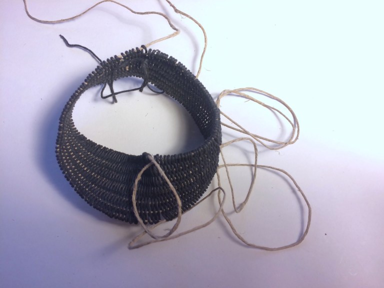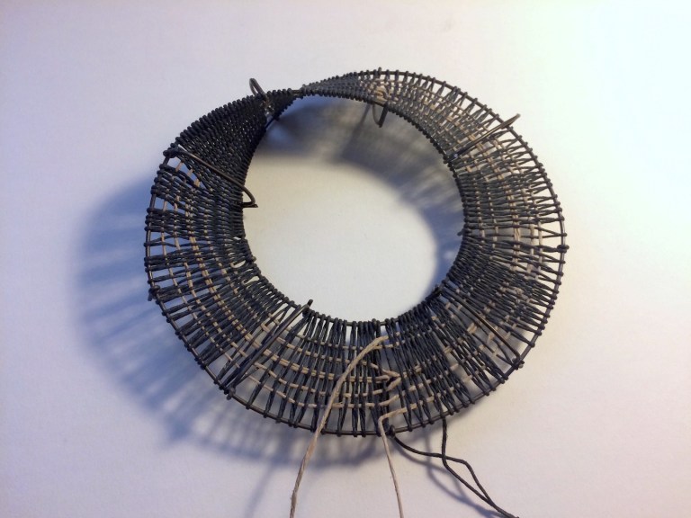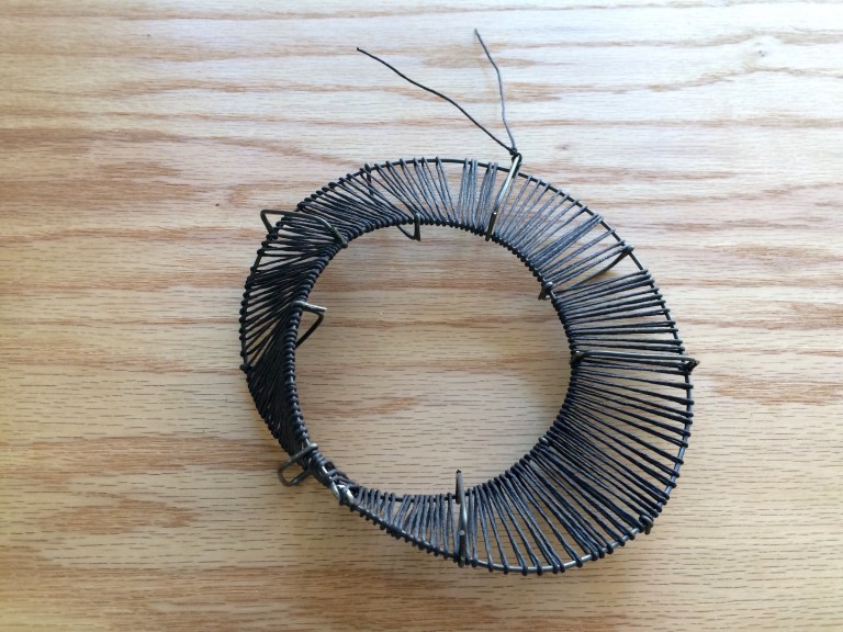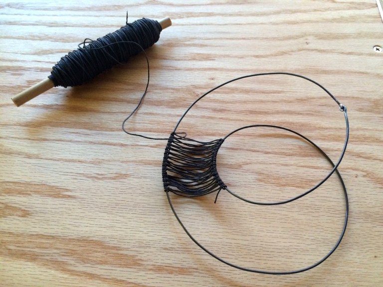 So I needed a special loom, to support the weaving process. My first attempt at loom construction was a single piece of wire, like so: