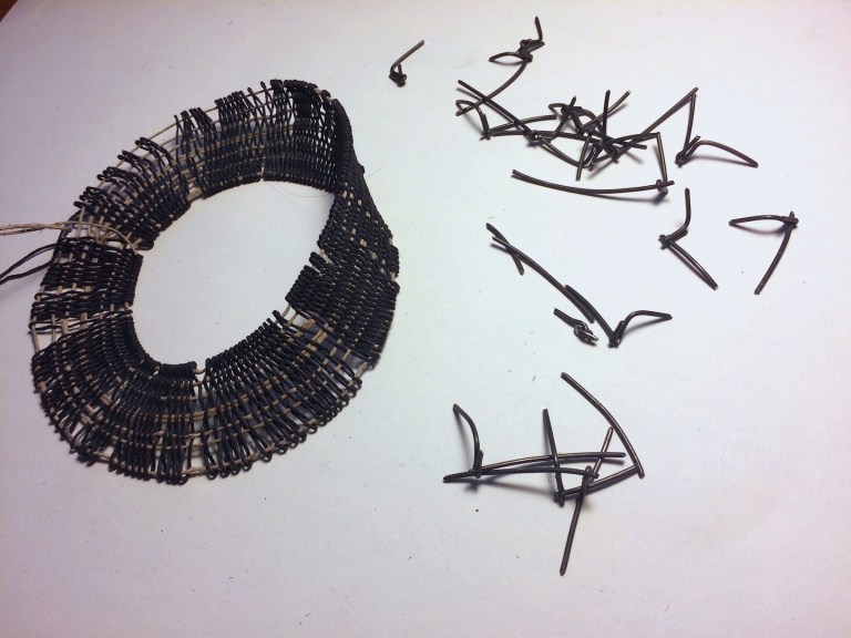 Once I was satisfied with the number of weft passes, it was finally time to remove the work from the loom. Only, in this case, the only way to accomplish this is to destroy the loom, turning it into pieces with my wire cutter. In other words, I removed the loom from the weaving!