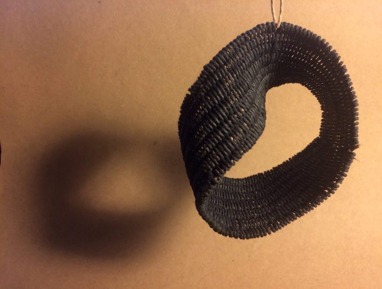 After making a handful of traditional pieces in Lou's studio and at home, I then couldn't resist the desire to make a weaving of an unconventional and special topology, the Möbius Strip. But simply weaving a strip and then joining it together at the ends with a single twist in the middle wouldn't do. I wanted it to be seamless, with the warp and the weft running uninterrupted throughout the whole band.
