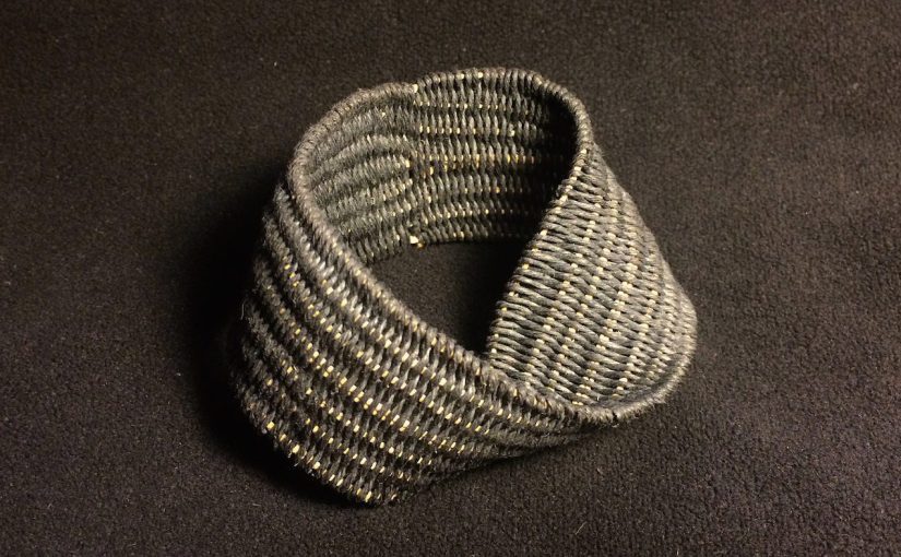 It is not immediately clear how to go about this. I can't merely start weaving from one edge to the other. Due to the counter-intuitive topology of the Möbius strip, every time you complete a pass around, along one edge, you end up back where you started but along the other edge. (Well, technically, a Möbius strip has only one edge, but if you just look at your local spot on the strip, then you can talk about it having two edges)