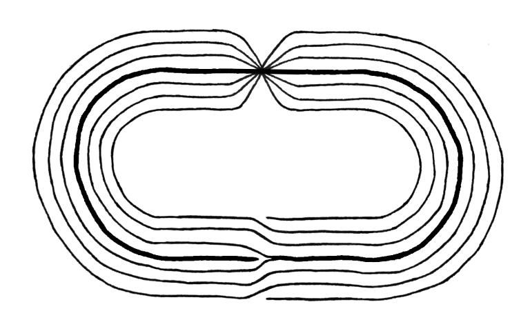 What I've done is to start the weft in the midline of the strip (indicated by the thick line in the above drawing), as two fibers doubled over and proceeding together. Then the weaving process proceeds symmetrically outwards, with two weft fibers advancing together, each new time around "switching sides" (but not really, because a Möbius strip has only one side, remember?)