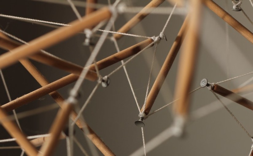 You have struts and tendons, tied together in such a way that they hold each other up. The struts undergo compression and the tendons undergo tension. In other words, you have sticks which push and strings which pull. Also, you get bonus points if you build a structure such that none of the sticks or strings are touching each other, the parts should be suspended in space. It should hold itself up by itself.