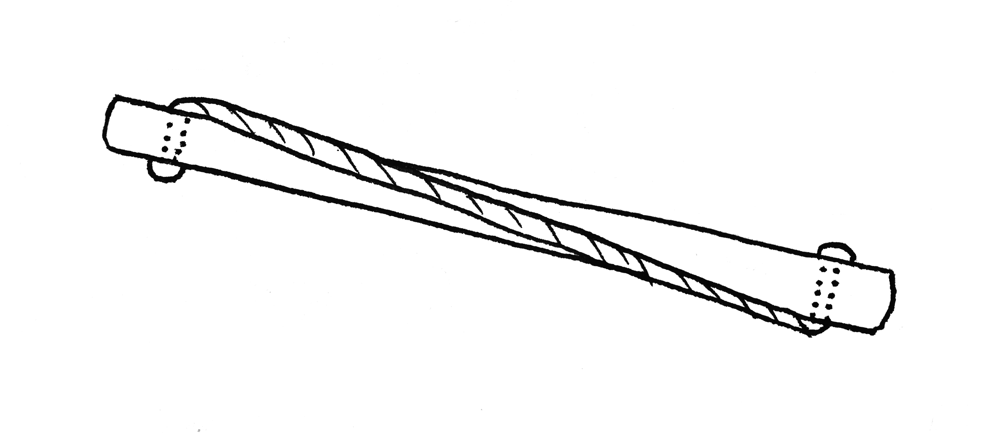 For structures requiring both pulling directions, this is a handy trick. It also applies to tendons which loop over a headless post such as a finish nail at the end of a strut. A loop would pull off the post with an upward pull, unless it was held down underneath another loop with a downward pull.