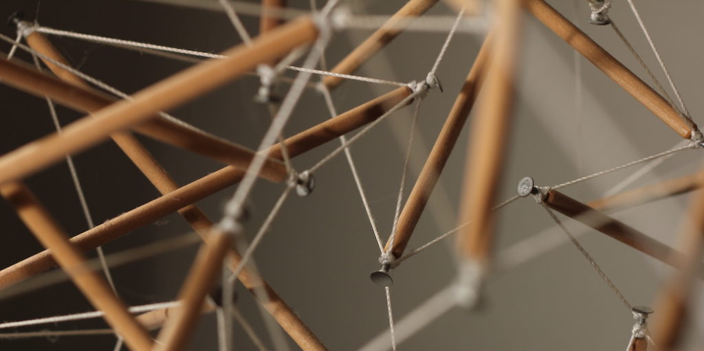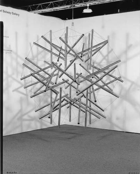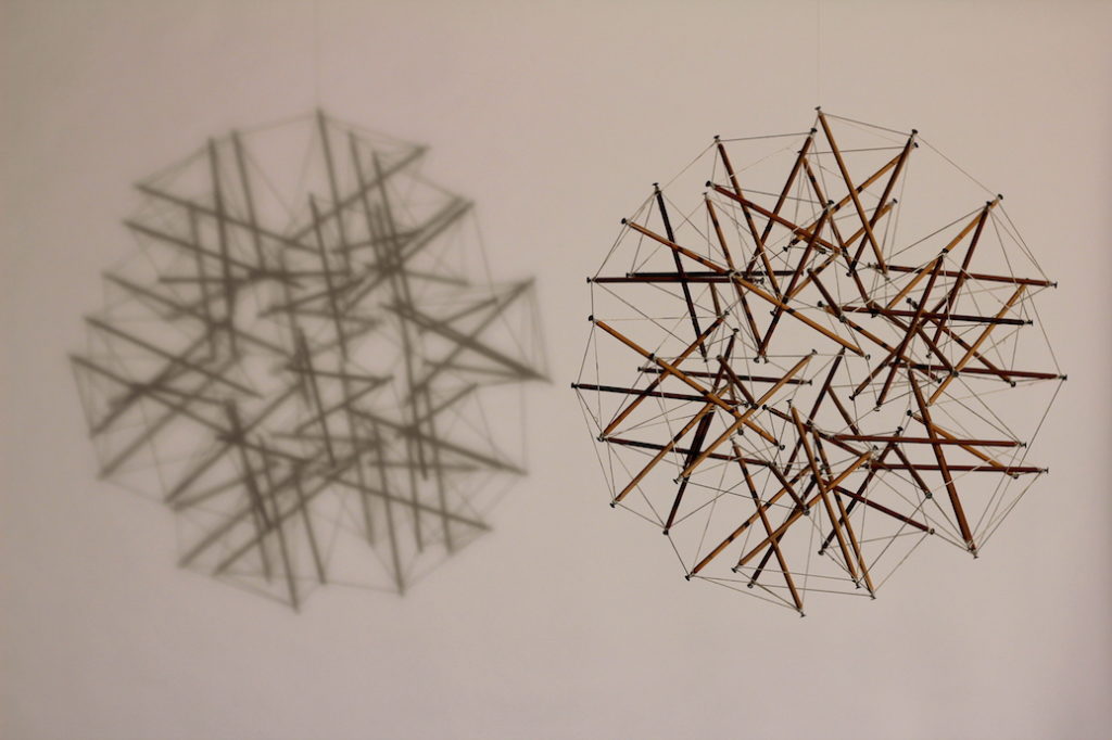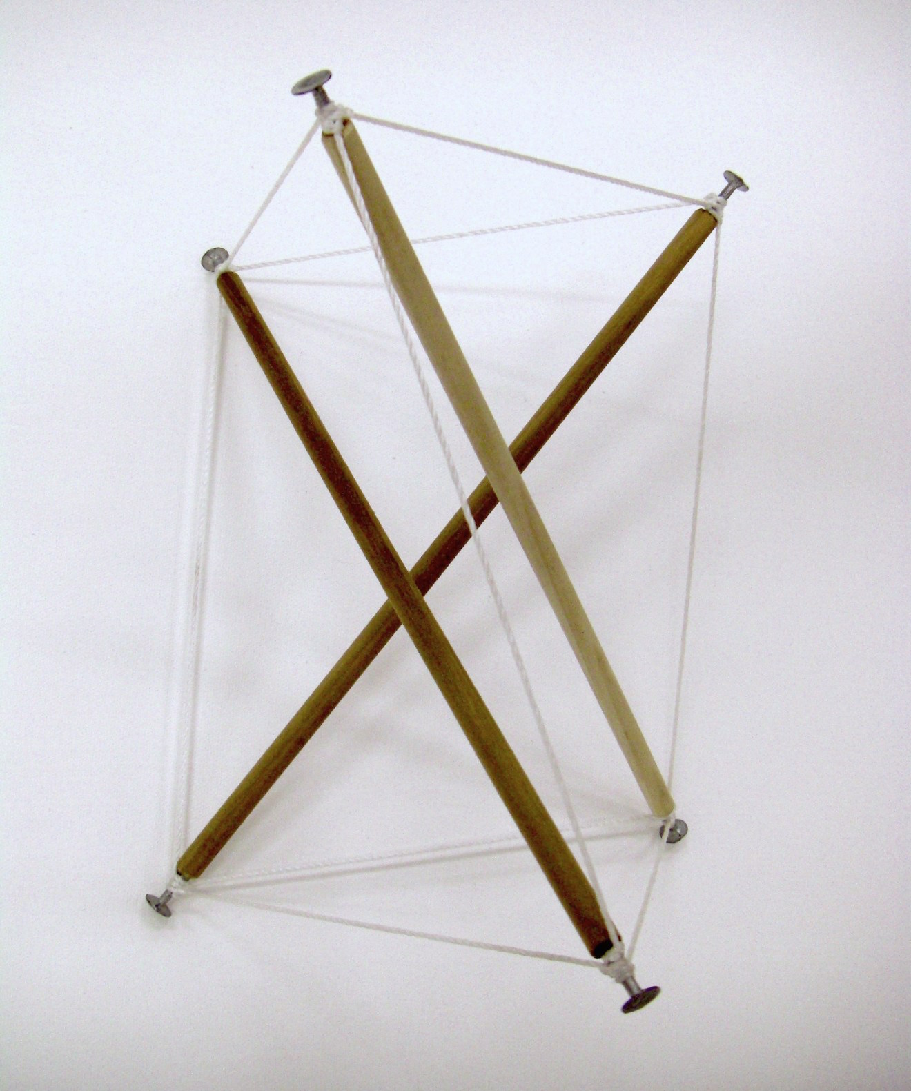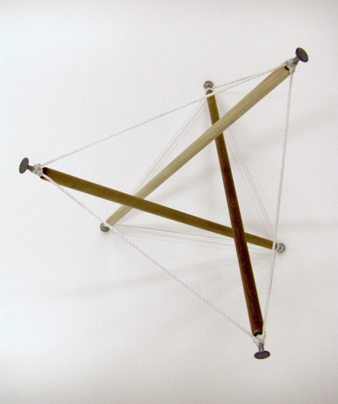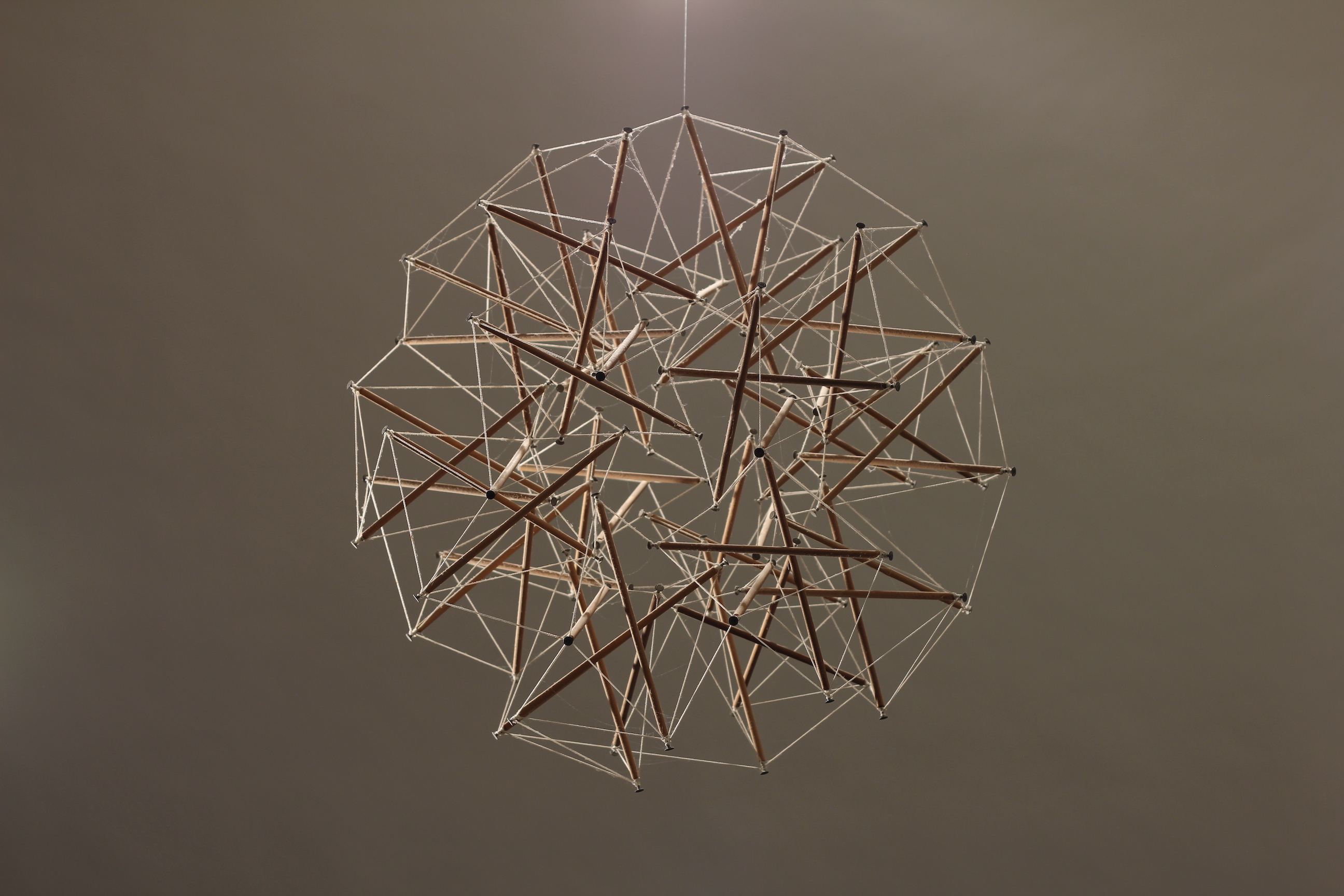 The structure is based on Buckminster Fuller's sculpture "Sixty-Strut Tensegrity Sphere". I was able to reverse-engineer Fuller's sculpture by studying a few photographs and puzzling through it. Once I had the geometry figured out, the rest was straightforward. I fabricated a bundle of struts (wooden rods with nails on the ends), and a collection of tendons (pre-cut lengths of nylon twine with the ends melted to form stoppers) and began making connections. The assembly process was fast and smooth, I was done in a weekend, and just like that, I had a model of Fuller's marvelous sculpture of my own. What a delight!