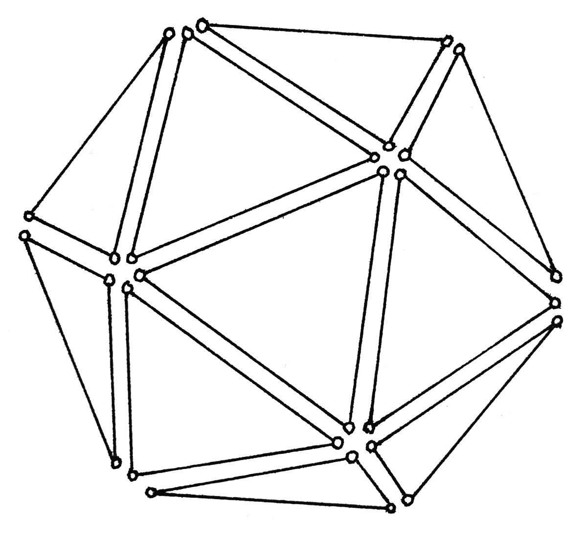 Fuller's sculpture specifically consists of twenty of these modules in a spherical arrangement. That accounts for the sixty struts, (20 x 3 = 60). But on the question of just what type of arrangement, I was stuck.