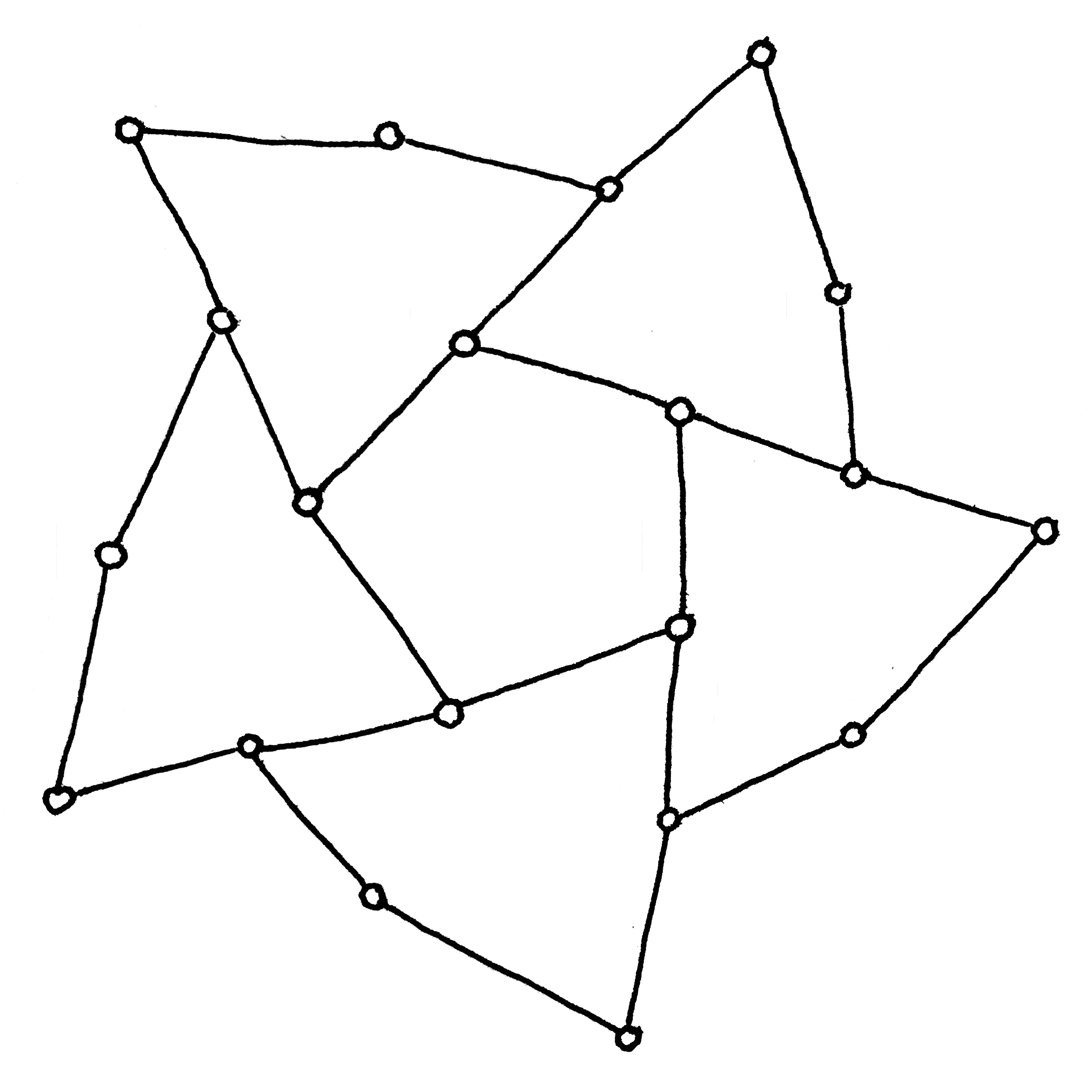 Here's a schematic of how the bases of the 3-prisms go together. Note that what would be single tendons if a three-prism module was in isolation, turn into split pairs of tendons when the modules go together. Kind of like a do-si-do.