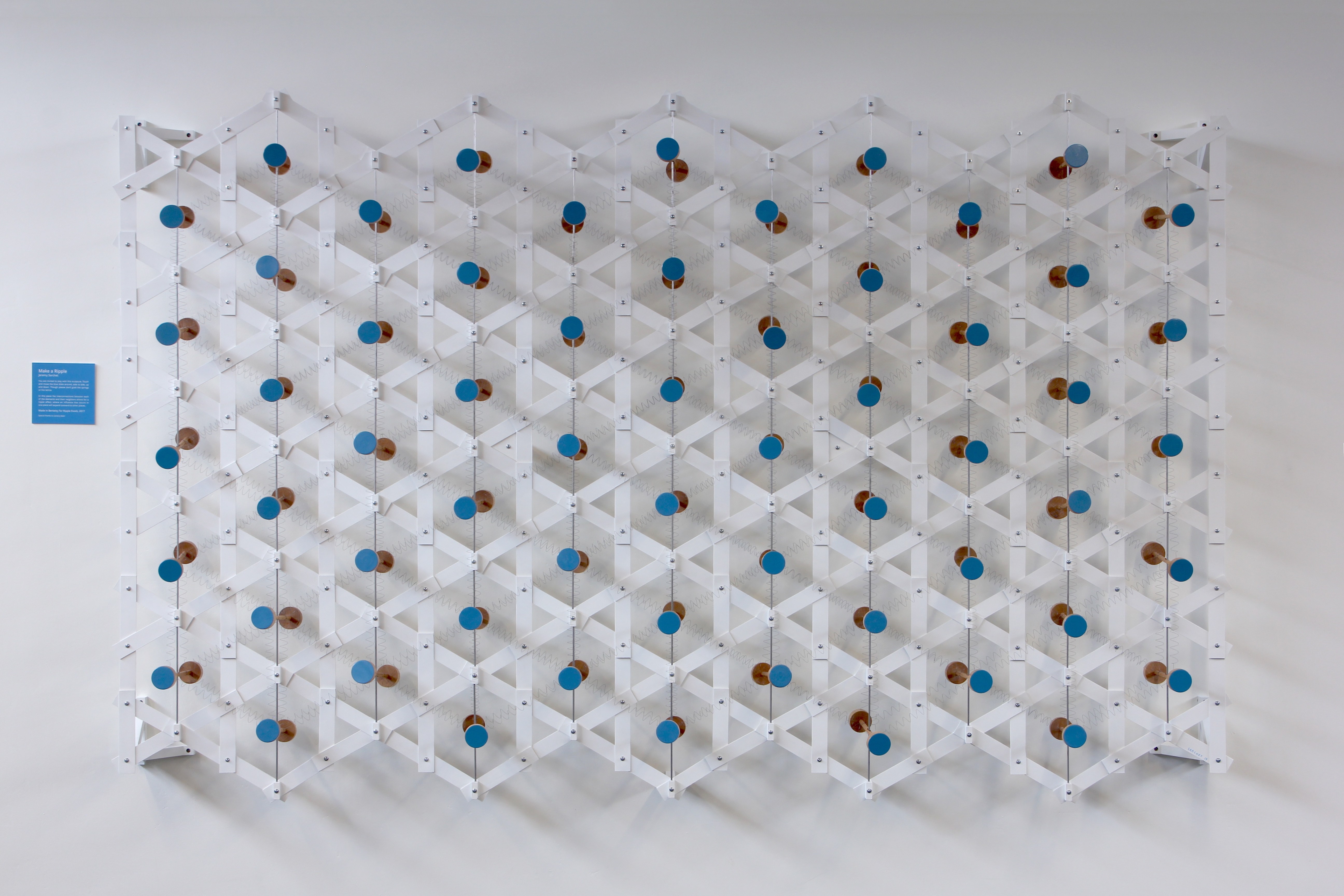 There are sixty rods that can each pivot and move around. They are each supported by a two-dimensional lattice, and their mounts allow them to swivel thanks to a kind of universal joint. Each rod is connected to its neighbors with a set of handmade springs. The springs unite the rods, serving as a common basis for interaction. It is the network of springs which serves as the medium that can transmit a movement and allow it to propagate outward as a wave. In this way, the whole arrangement is a manifestation of the ripple effect.
