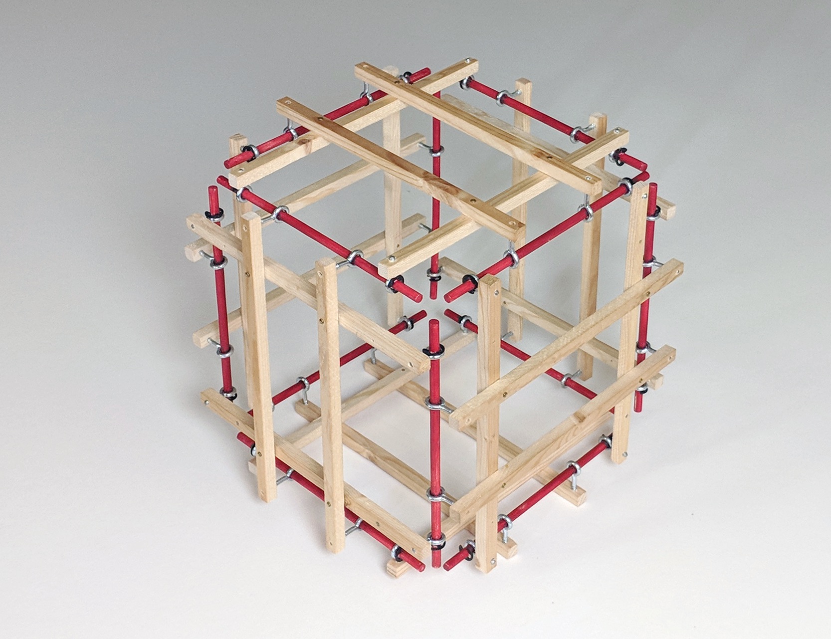 This sculpture is designed to be picked up and played with. Expand it, collapse it, skew it. See how many different forms it can take. Notice the extents of the range of motion of the linkages. See if you can identify groups of edges which remain parallel. Does the volume change as you transform its proportions?