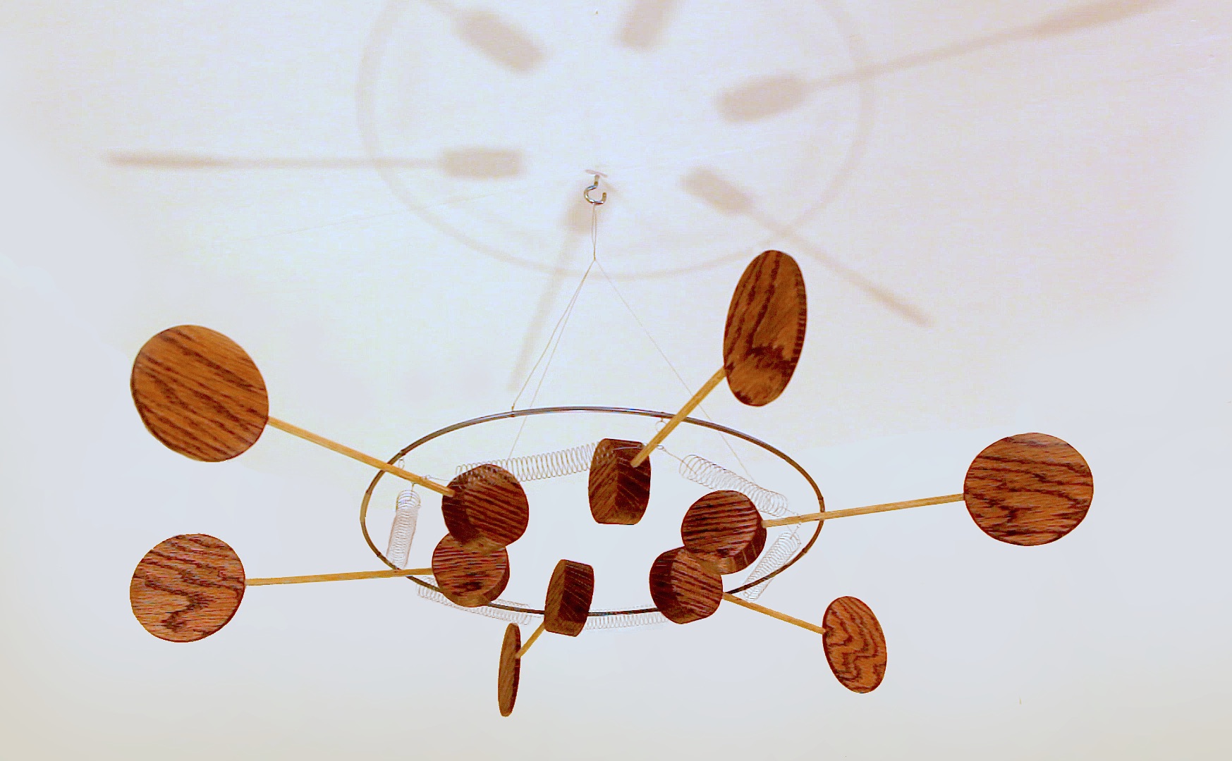 My favorite way to get this sculpture moving is to have the whole thing swinging from its point of suspension. Then the rods, which are each balanced, try and maintain their original horizontal orientation while the hoop is banking and angling back and forth and around and around. The result is that the rods develop a pivoting motion with respect to the stirring hoop and everything comes alive.